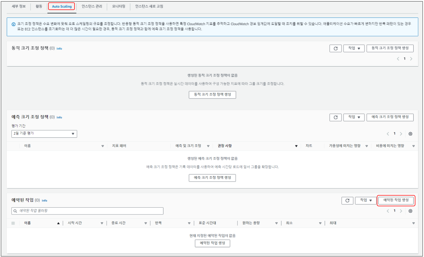 - EC2 → Auto Scaling 그룹 → {Auto Scaling 그룹 name} → Auto Scaling → 예약된 작업 생성