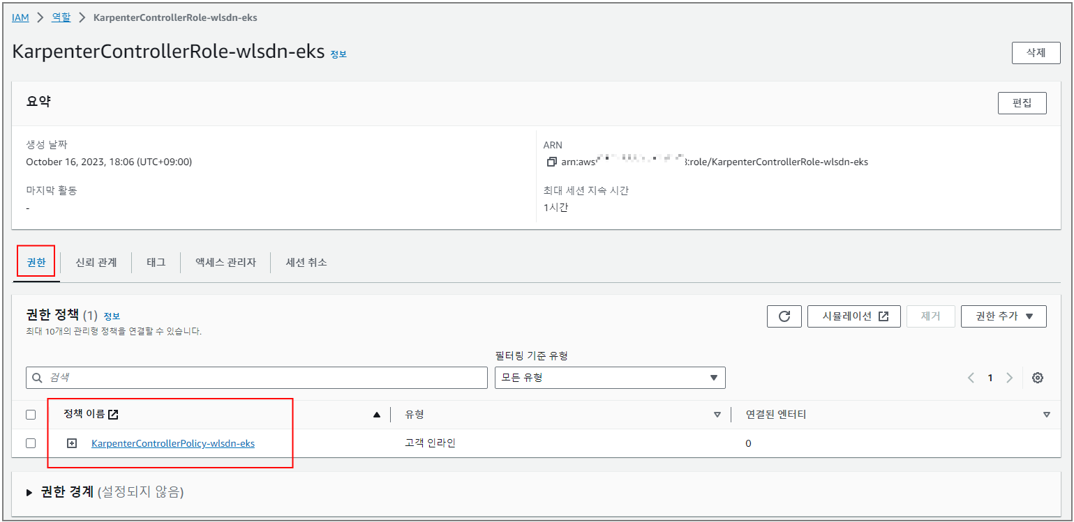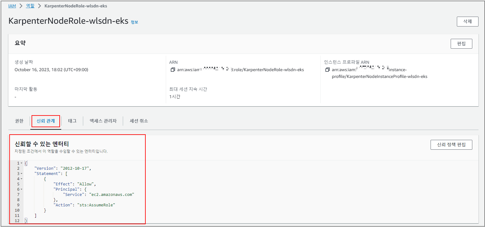 KarpenterControllerRole이라는 IAM Role을 생성 후 아래와 같이 필요한 정책 및 신뢰관계를 추가한다.