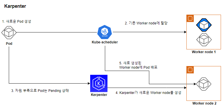 - Karpenter는 Pending 상태의 Pod를 감지하고 새로운 Worker node를 생성한다.
