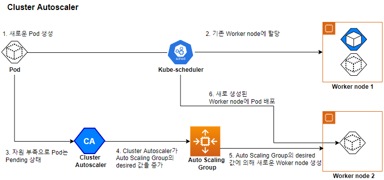 - Cluster Autoscaler는 Pending 상태의 Pod를 감지하고 Auto Scaling Group의 desired 값을 증가시킨다.