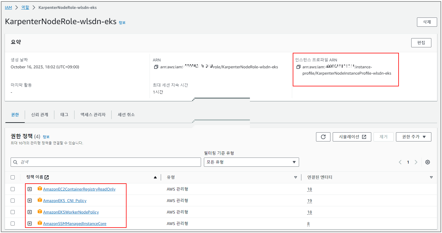 KarpenterNodeRole이라는 IAM Role을 생성 후 아래와 같이 필요한 정책을 추가한다.