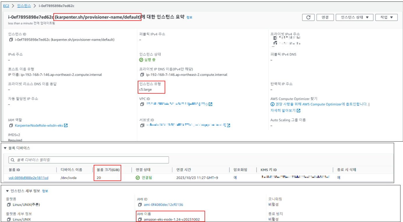 노드 이름은 "karpenter,sh/provisioner-name/{Provisioner 이름}"으로 생성되었고 Provisioner와 AWSNodeTemplate 설정에 맞게 노드가 생성된 것을 확인할 수 있다.
