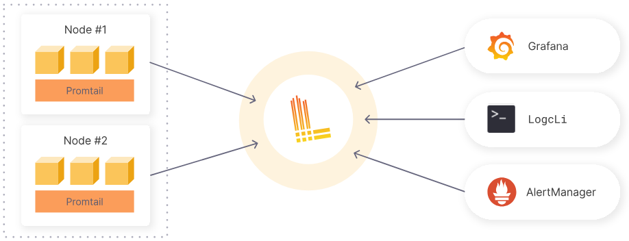 Loki를 위해 만들어진 로그 수집 도구인 Promtail을 통해 로그를 가져와 로그를 저장한다. 이후 Grafana에서 LogQL이라는 쿼리 언어를 통해 로그를 검색하게 된다. 또한 경고 규칙을 설정하여 Prometheus Alertmanager로 경고를 보낼 수 있다.