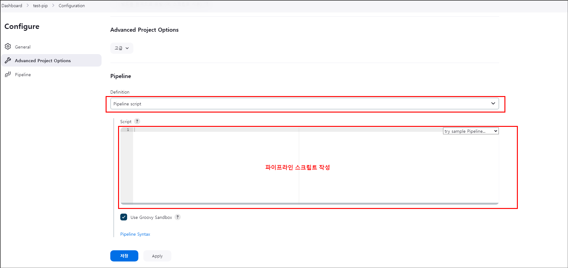 파이프라인 부분에서 'Pipeline script' 선택 후 Script에 파이프라인 스크립트를 작성한다.