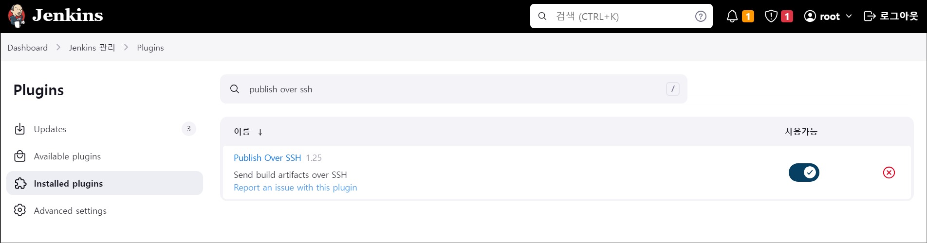빌드된 파일 전송 및 명령 실행을 자동화하는 데 사용되는 'Publish Over SSH' 플러그인을 설치한다.