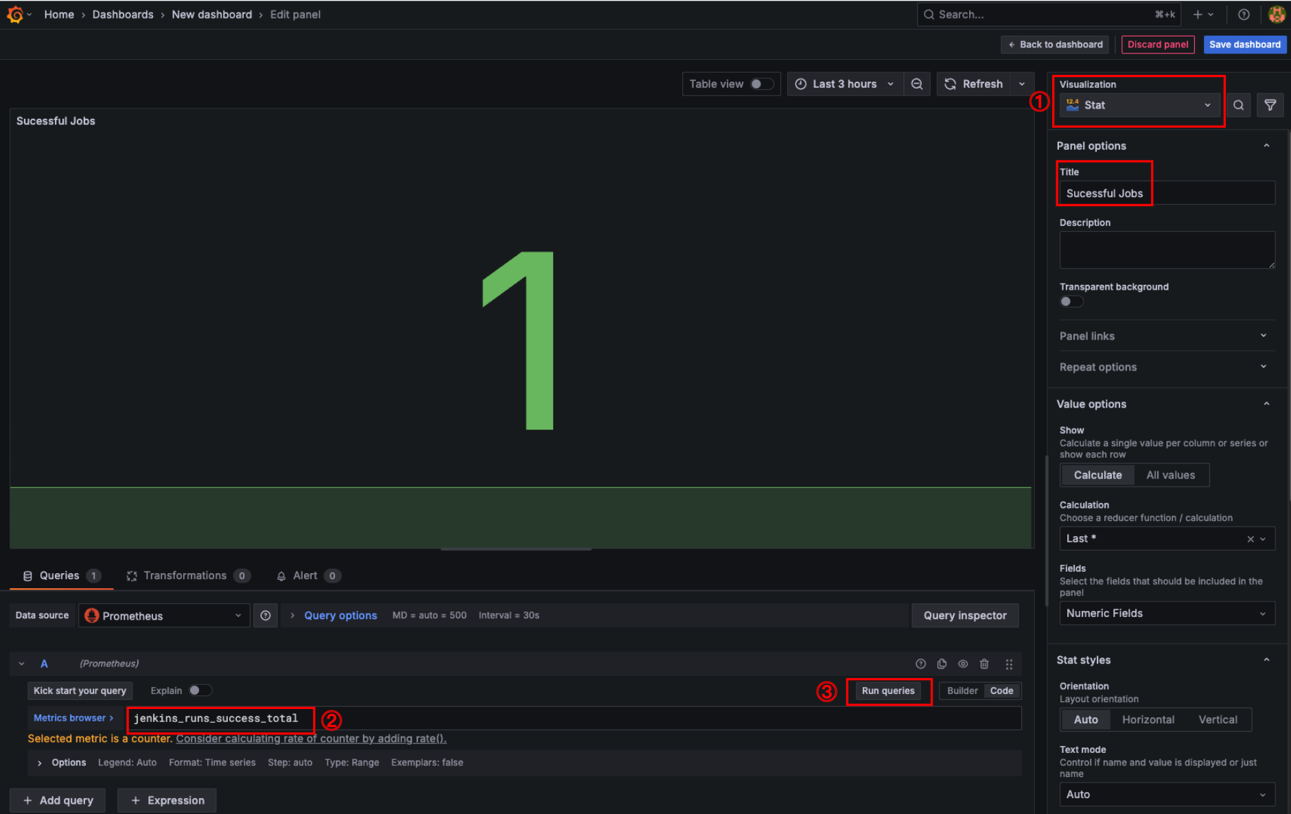 앞서 진행했던 것처럼 jenkins 파이프라인 Job에서 성공한 횟수 패널을 추가한다.